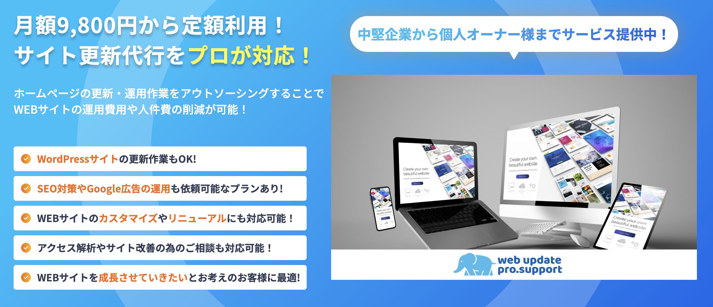 月額9,800円からWEBサイトの管理が任せられる!